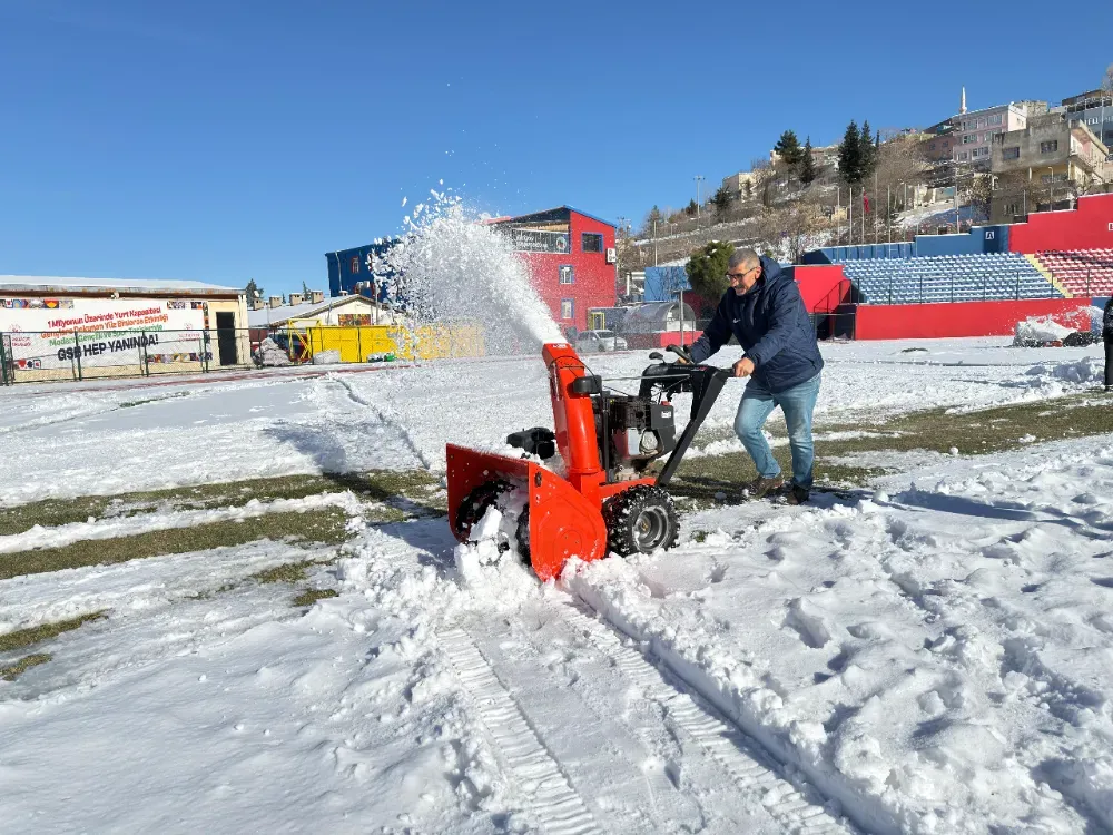Mardin’de etkili olan yoğun kar yağışının ardından karla kaplanan Mardin 21 Kasım Şehir Stadyumu zemini kar küreme aracıyla temizlendi.