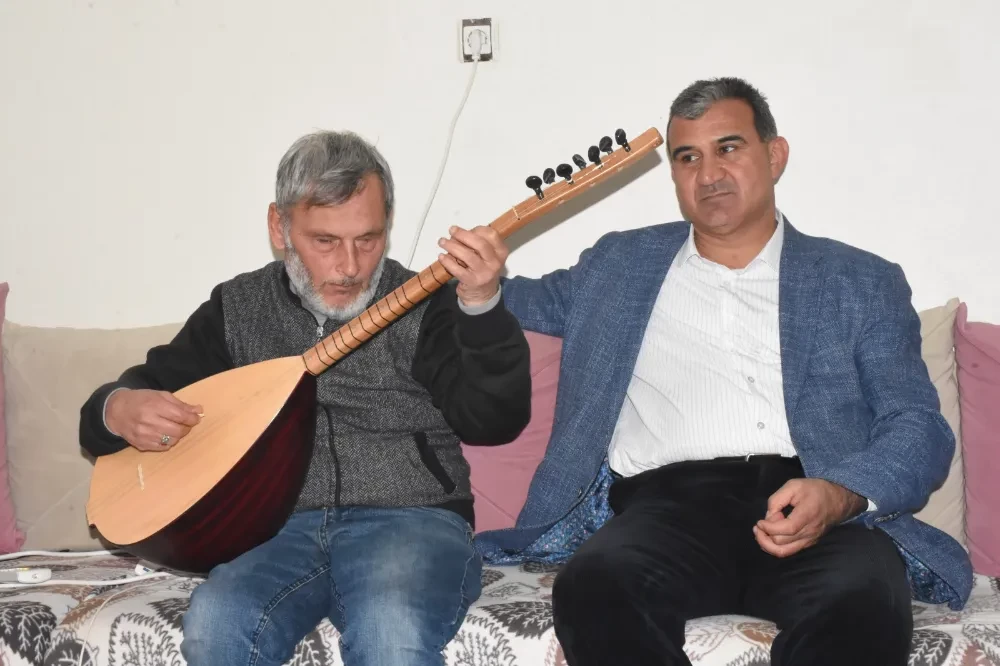Belediye Eş Başkanı Cengiz Temelli , Kültür ve Sosyal İşler Müdürü ve Kültür ve Sosyal İşler müdürlüğüne bağlı engelli birimi tarafından kendisine hediye edilen bağlaması ile Eş Başkana müzik dinletisi yaparak Derik Belediyesine teşekkürlerini iletti.