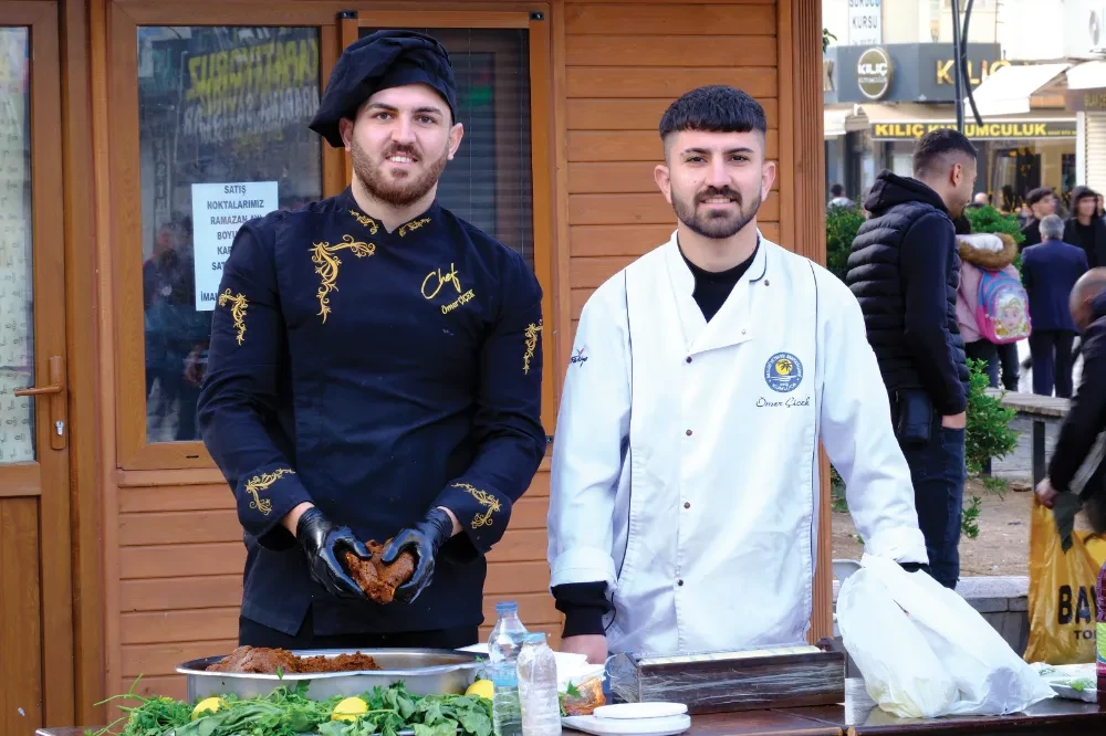 İftar saatine yakın bir zaman kala ustalar tarafından büyük emek ve özenle hazırlanan çiğ köfte için tezgahların önünde kuyruklar uzadıkça uzuyor. Ustalar siparişleri yetiştirmek için büyük çaba sarf ediyor.