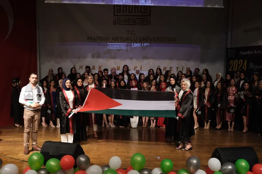 Mardin Artuklu Üniversitesi’ni başarıyla bitirip mezun olmaya hak kazanan öğrenciler keplerini, mutlu bir gelecek ve özgür Filistin için fırlatıldı.