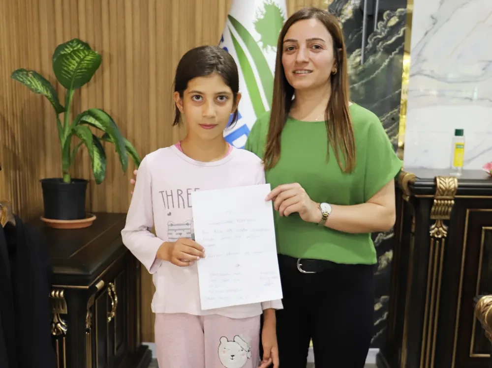 Mazıdağı Belediye eş başkanlarına talep ve isteklerini belirtmek amacıyla yurttaşların ziyaretleri devam ediyor. Yapılan ziyaret kapsamında 12 yaşındaki Behiye Arız adlı küçük kız Eş Başkan Kudret Uçuk’u makamında ziyaret etti. Ziyarette kendisinin ilçe Kayalar mahallesinde oturduğunu ve çocukların kullanım alanı olarak kullanabileceği bir parklarının dahi olmadığını Uçuk’a aktaran Arız, mahallerinde park yapılması talebinde bulunarak Uçuk’a hazırlamış olduğu dilekçeyi verdi.