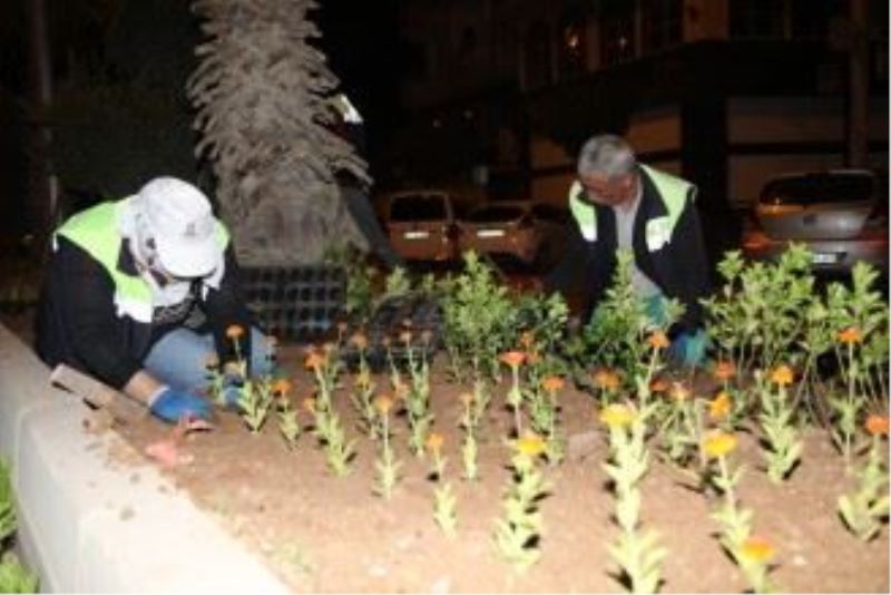 Mardin’in Kızıltepe ilçesinde yaz sıcakları ve ramazan sebebiyle gece çalışan belediyenin kadın işçileri kendi elleriyle yetiştirdikleri  350 bin çiçek fidanını toprakla buluşturuyor.